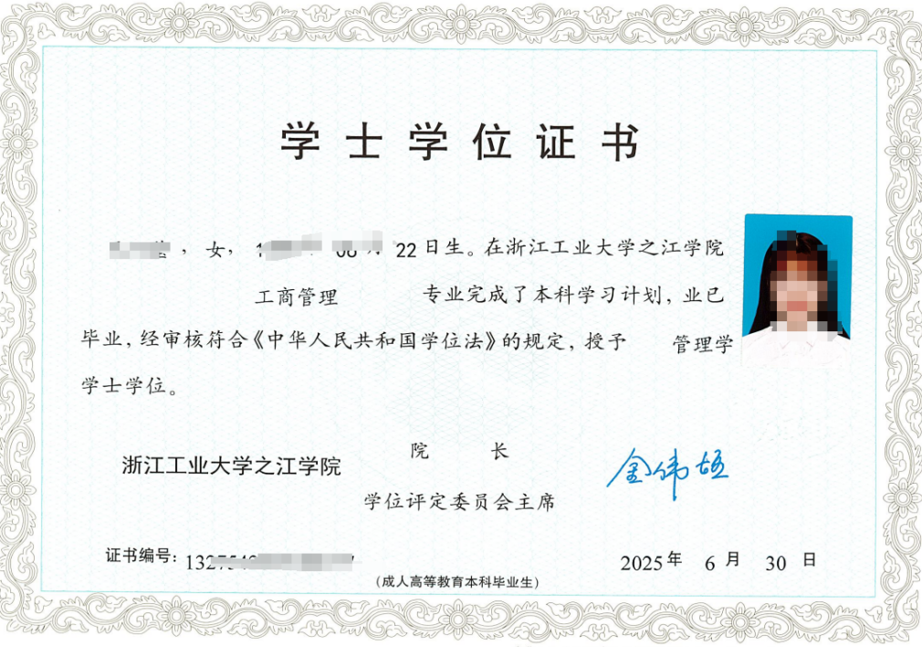 正式录取并注册学籍的学生,完成教学计划要求的课程(含毕业环节)学习,且考核合格,可获得由浙江工业大学之江学院颁发、教育部电子注册的成人高等教育本科学历证书。符合浙江工业大学之江学院成人高等教育学士学位授予条件者,可授予学士学位。